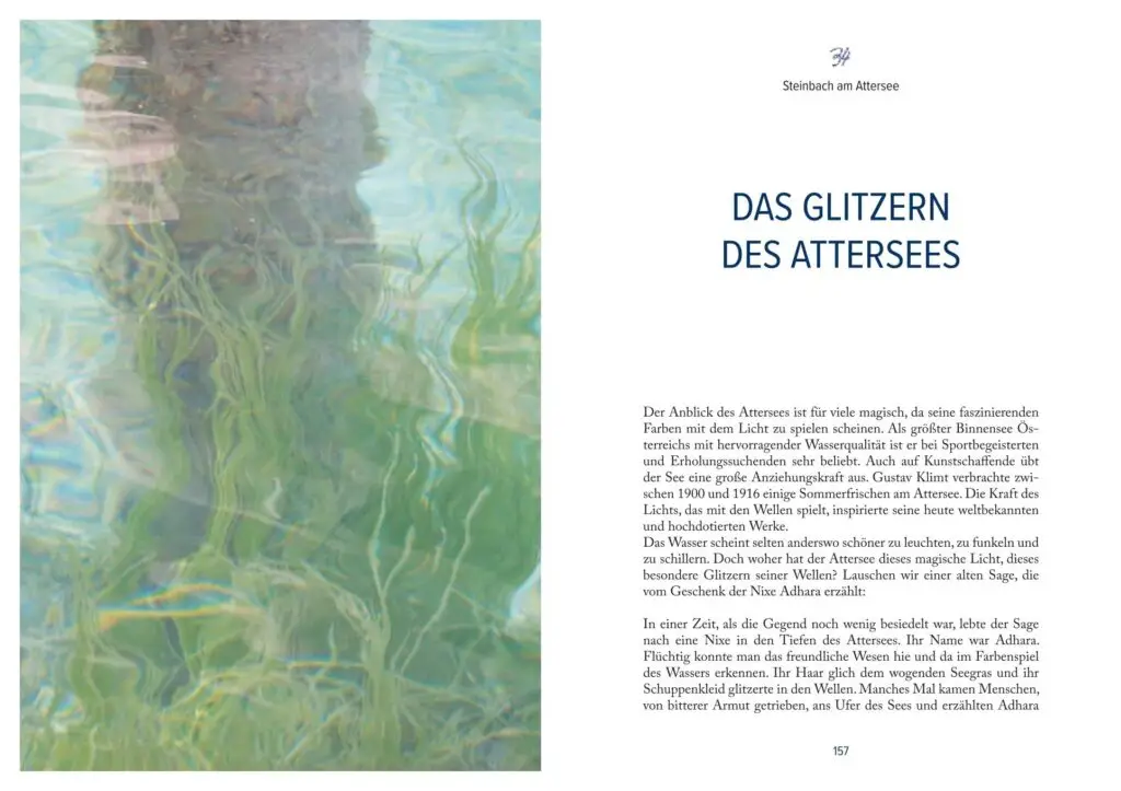 Es war wohl kein Zufall, dass ich ausgerechnet jene Seite als erstes öffnete, auf der es um „Das Glitzern des Attersees“ geht, das ich von meinem Bürofenster betrachten darf. In dem Foto von Autorin Dagmar Fetz-Lugmayr spiegeln sich tatsächlich so etwas wie die Haare der Nixe Adhara. „Ihr Haar“, heißt es da „glich dem wogenden Seegras und ihr Schuppenkleid glitzerte in den Wellen“. Die Geschichte ist mir natürlich reichlich bekannt. Neu ist für mich allerdings, wie der Weißenbach zu seinem Namen kam. Dazu habe ich – weil es einige Weißenbäche im Salzkammergut gibt – schon viel geforscht, aber noch keine hinreichende Antwort gefunden.